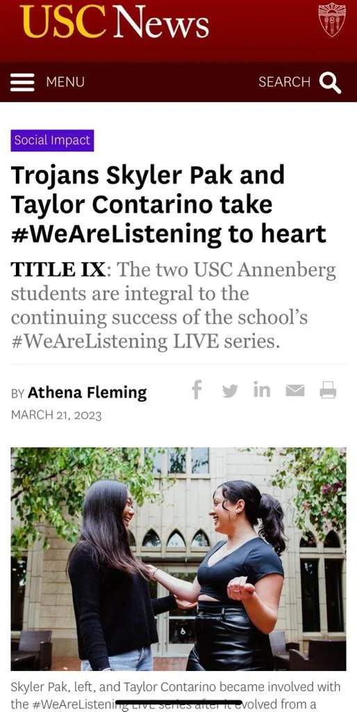 You never really know what goes on behind the scenes. Oh, how this rings so true. Moments after I reposted an Instagram story Annenberg had put up of the article USC News, published titled “Trojans Skyler Pak and Taylor Contarino take #WeAreListening to heart,” I laid in a pitch black room for an hour just praying my migraine would subside. I put my ice hat on and finally just let it all out.